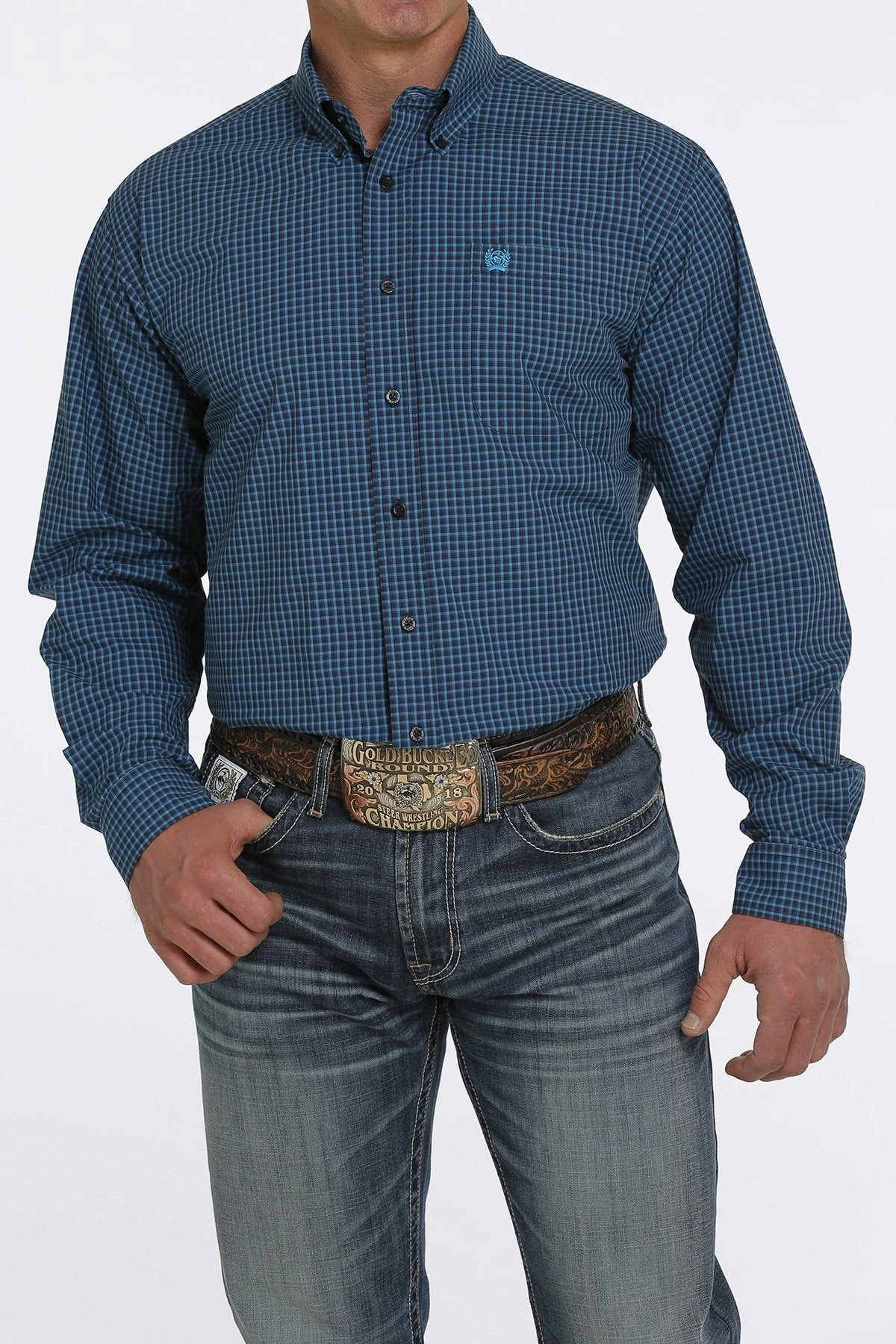 Navy and Turquoise Plaid Long Sleeve Button Down Shirt.