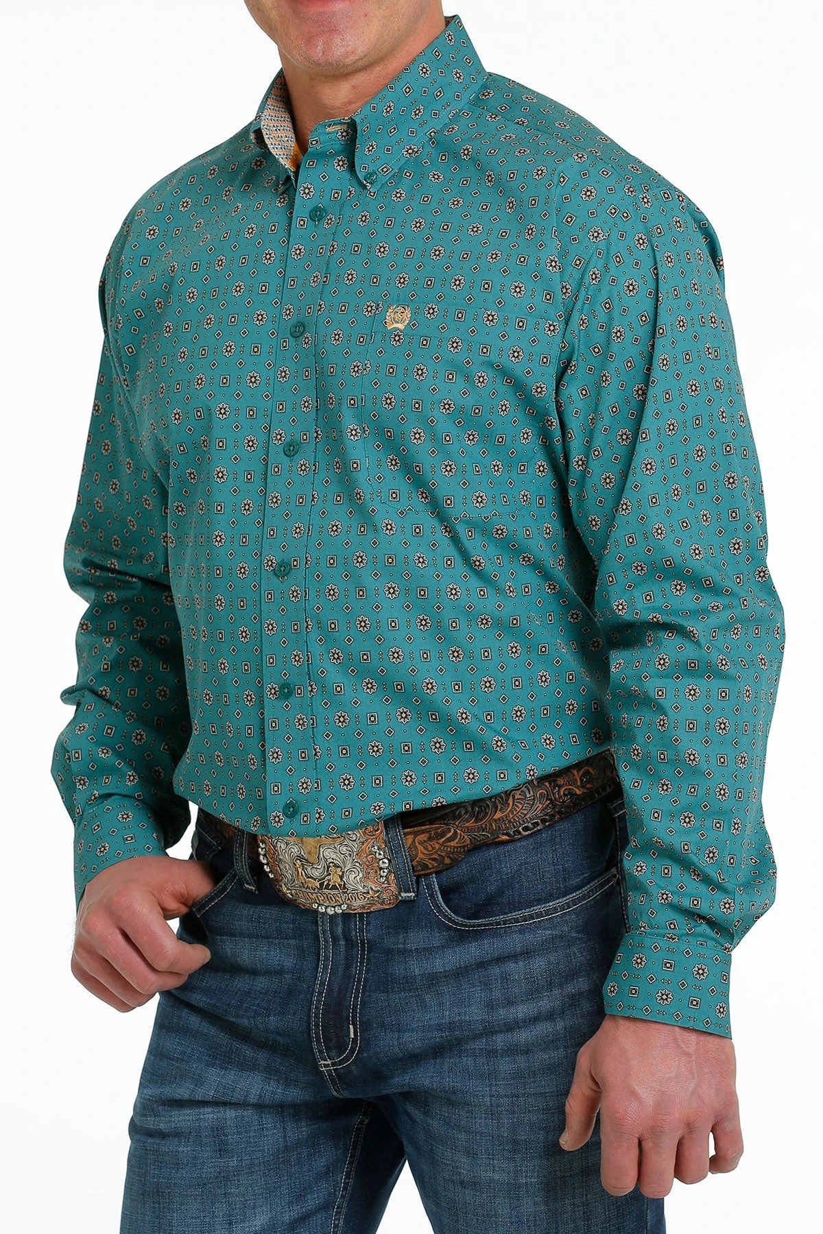 Teal with Black Pattern Long Sleeve Button Down Shirt.