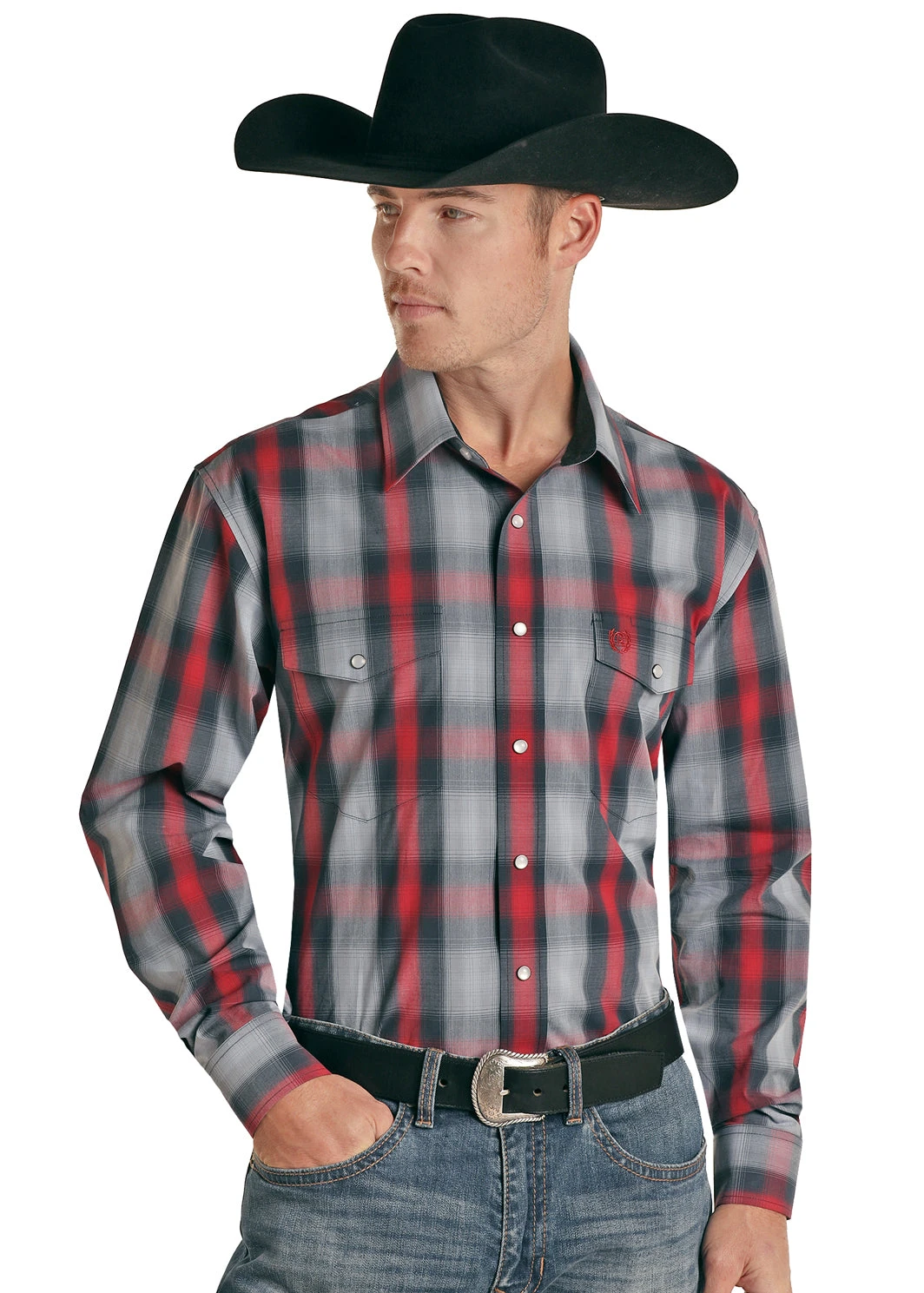 Grey and Red Plaid Long Sleeve Snap Front Shirt.