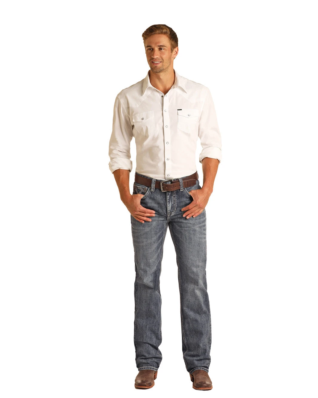 Medium Wash Double Barrel Straight Jean with Two Tone Raised Denim V Pocket.
