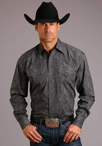 Grey Aztec Print Long Sleeve Snap Front Shirt.