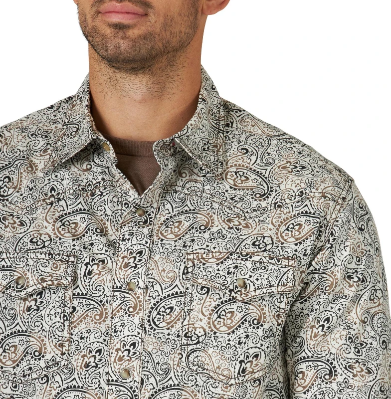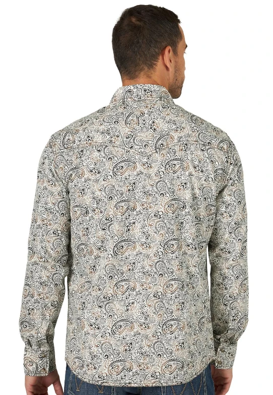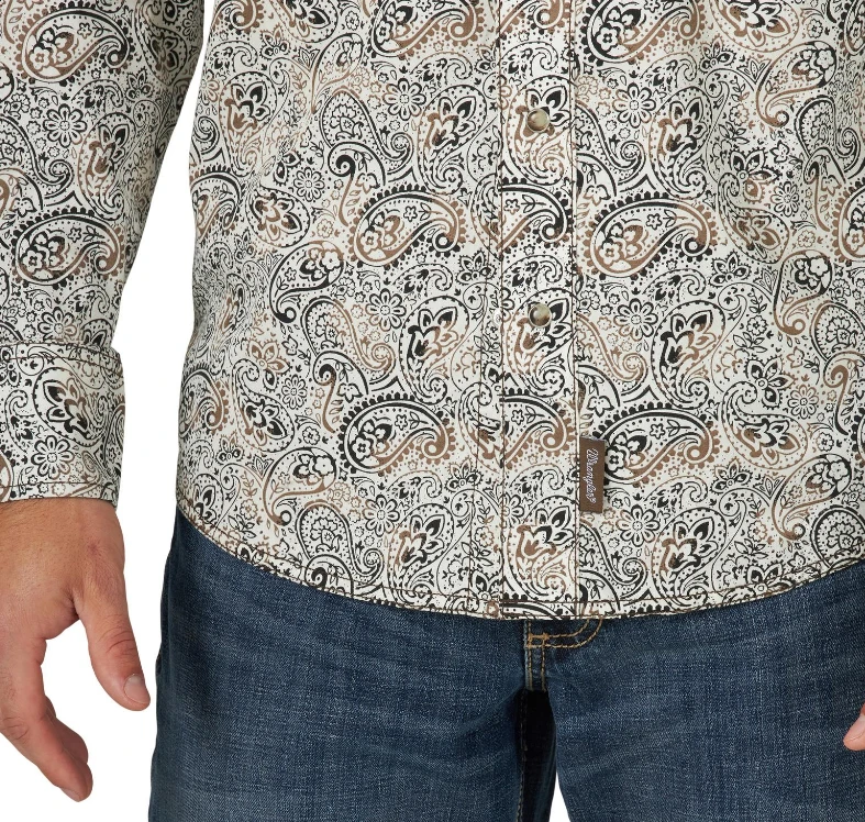 White and Brown Paisley Print Long Sleeve Snap Front Shirt.