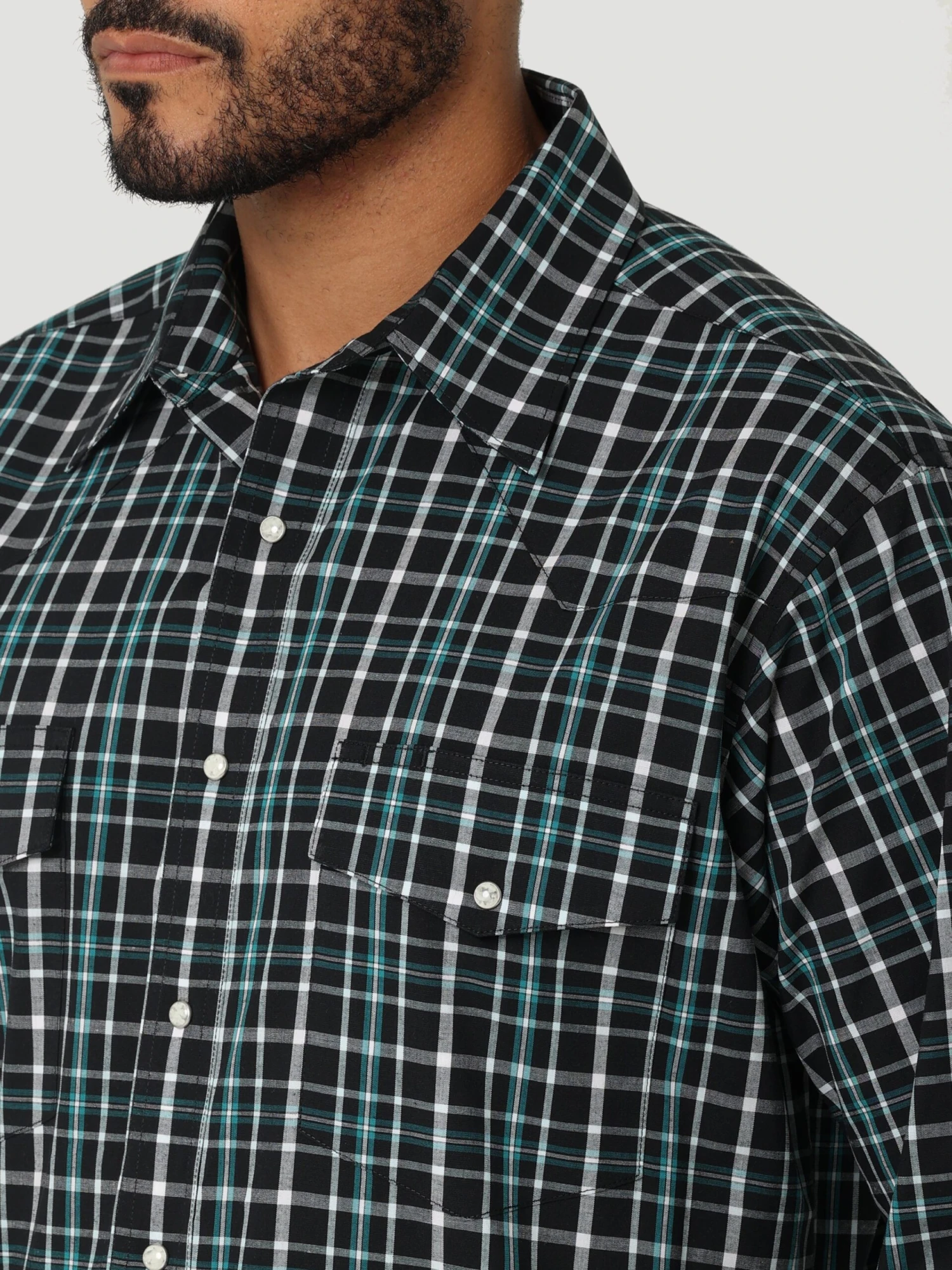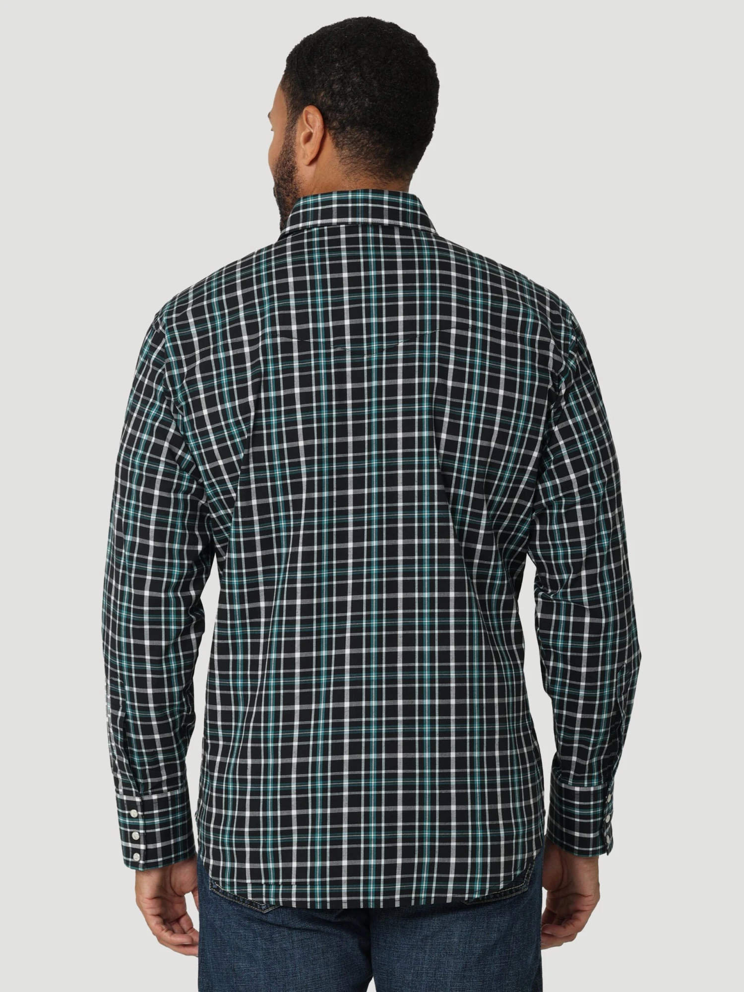 Black and Dark Teal Plaid Long Sleeve Wrinkle Resist Relaxed Fit Snap Front Shirt.